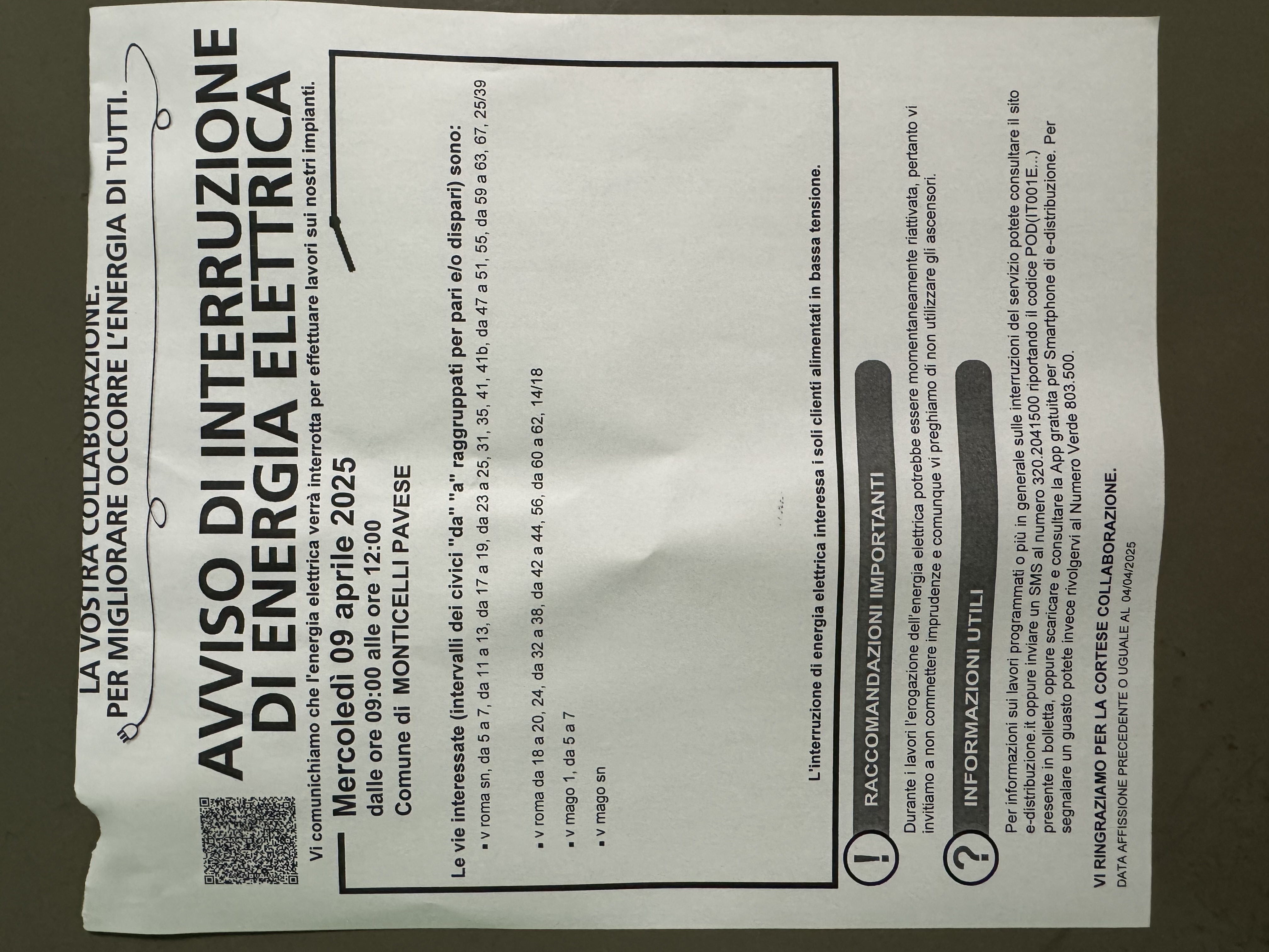 Si comunica che mercoledì 09 aprile ci sarà un'interruzione di energia elettrica per lavori di manutenzione impianti.