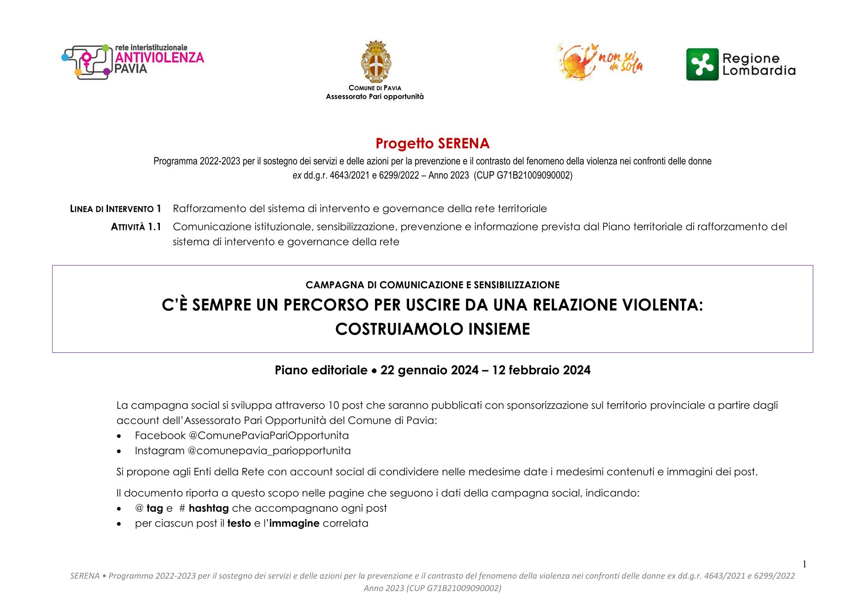 La campagna social si sviluppa attraverso 10 post che saranno pubblicati con sponsorizzazione sul territorio provinciale a partire dagli account dell'Assessorato Pari Opportunità del Comune di Pavia.